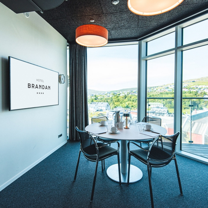 Krákugjógv is a smaller meeting room on our top floor with scenic vistas. The room is ideal for smaller meetings of up to 6 participants, job interviews and the like. The room is equipped with a screen, flipchart, whiteboard and a printer.